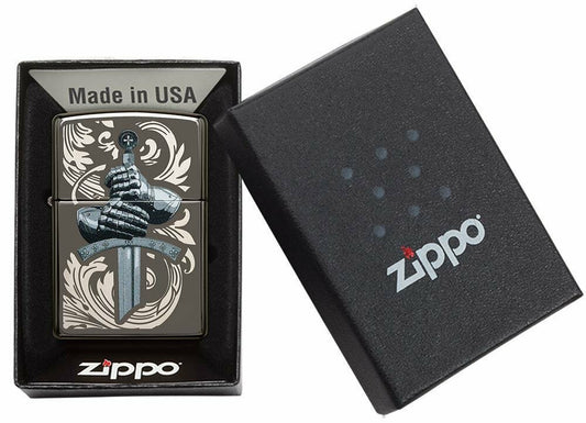 Zippo Medieval Knights Glove and Sword, Black Ice Finish Pocket Lighter #49127