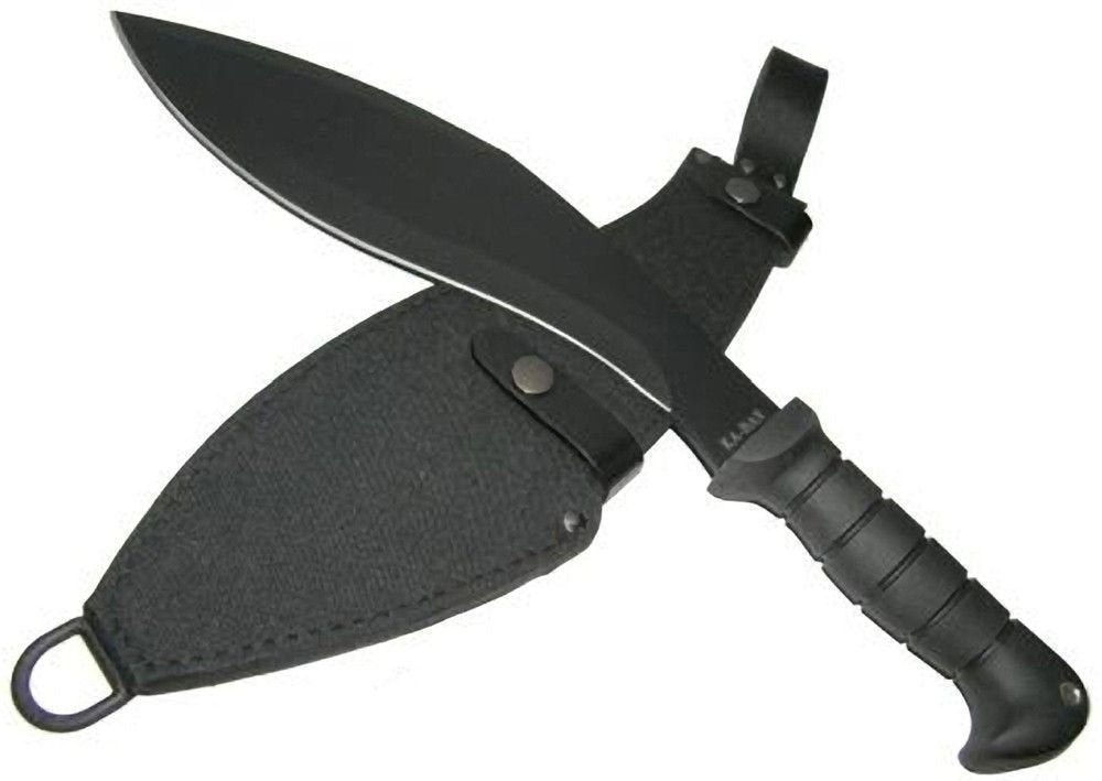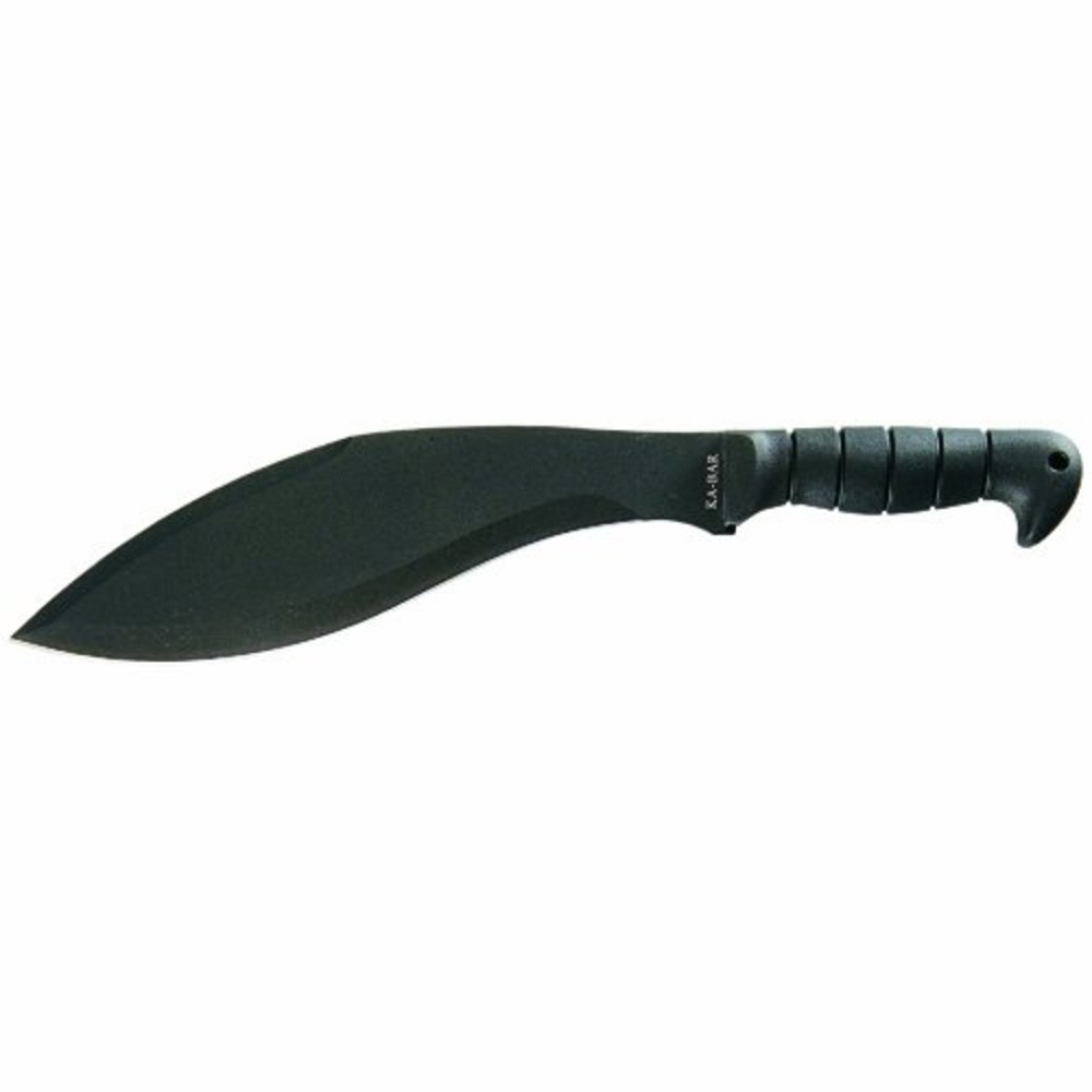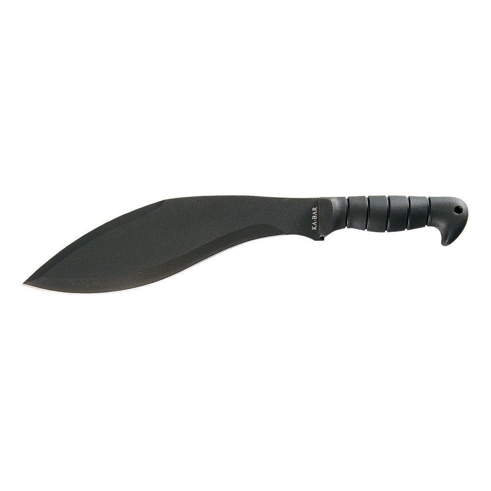 KA-BAR Kukri Machete Fixed Knife KB1249 is a large scale machete designed to make short work of stubborn brush and wood. This perfectly-weighted KA-BAR knife features a Kukri machete blade made from 1085 Carbon steel and honed to a 0.165" thick straight edge. KA-BAR Kukri Black Finish Machete gives you unparalleled grip with a non-slip Kraton G handle, equipped with an ergonomic shape and a flared pommel to give you the best control over the knife. KA-BAR has equipped the Kukri Machete with an attractive black finish from blade to handle, and it comes with a lanyard hole and a leather/Cordura sheath to aid in transportation. For a uniquely designed machete that can tackle any task, use the KA BAR Plain Edge 11.5in Kukri Machete.