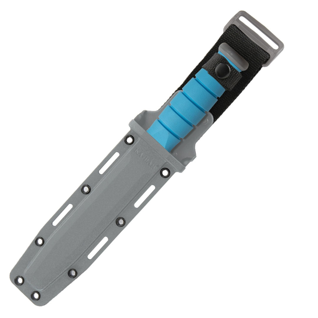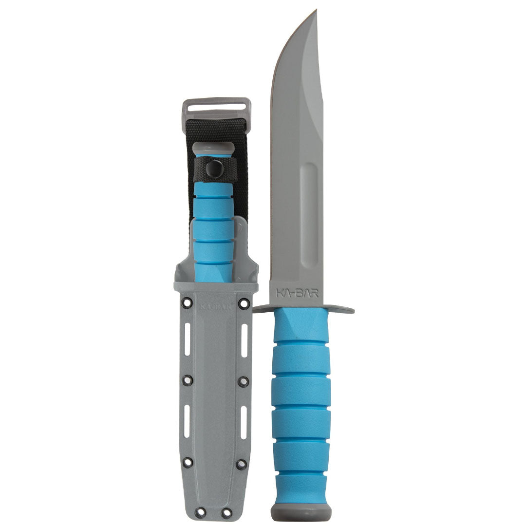 Introducing the tried-and-true KA-BAR Fighting/Utility Knife to a post-orbital world. Made with battle-tested 1095 Cro-Van steel, the blade has a grey powder coating and is marked “KA-BAR”. The handle is blue Kraton G® and is carried in a grey hard plastic sheath that is MOLLE-compatible.