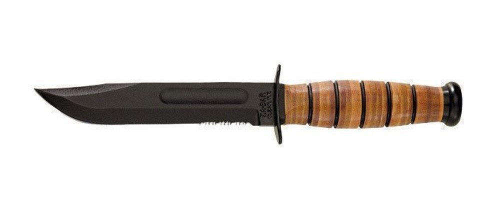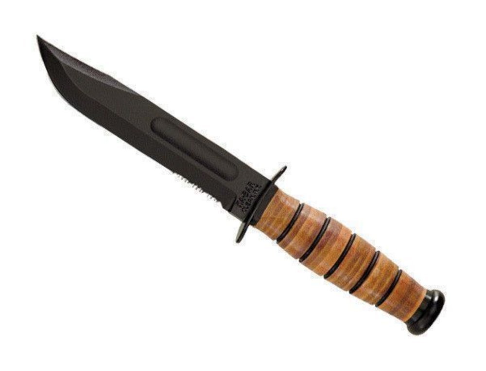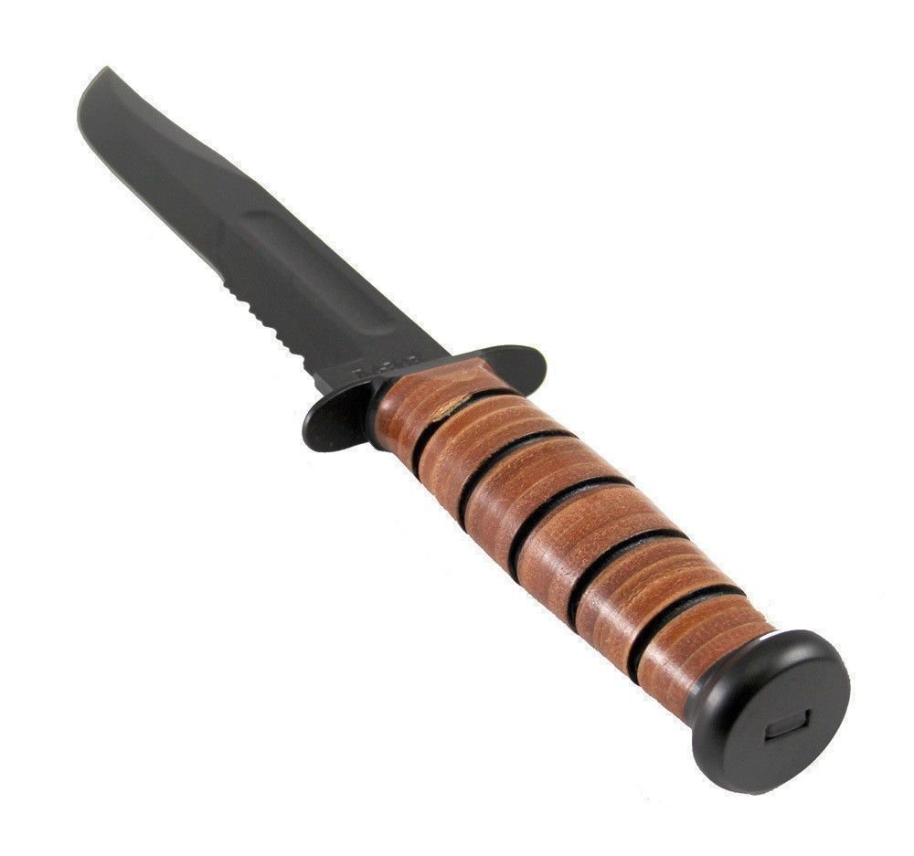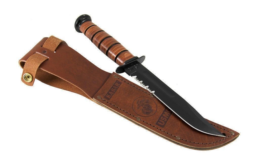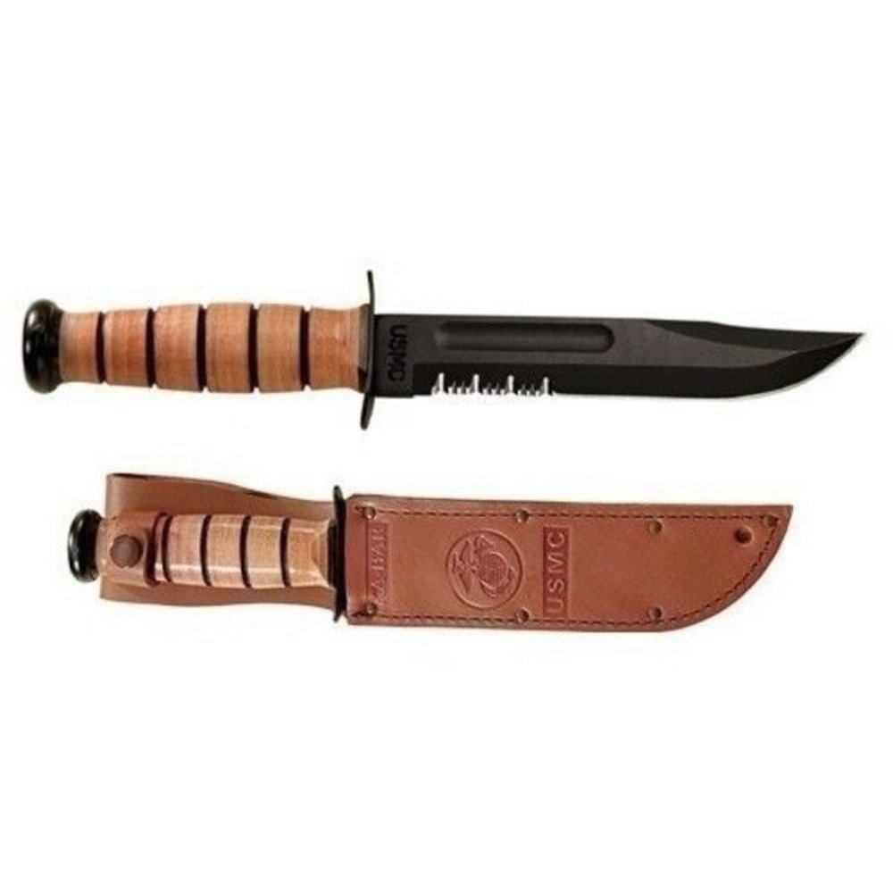 The most famous knife in the World gets updated with a serrated edge to better cut synthetic and looped materials.. The blade is black coated 1095 Cro-Van steel and stamped USMC.