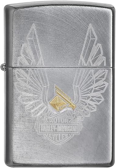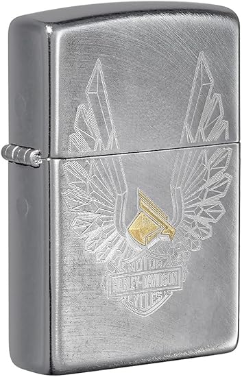 Show your passion for freedom and the open road with the Zippo Harley-Davidson Golden Eagle Lighter. This brushed chrome Zippo features a bold and detailed golden eagle design, symbolizing strength and independence, with the legendary Harley-Davidson logo integrated into the artwork.