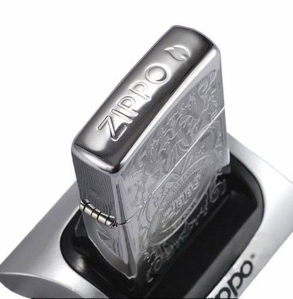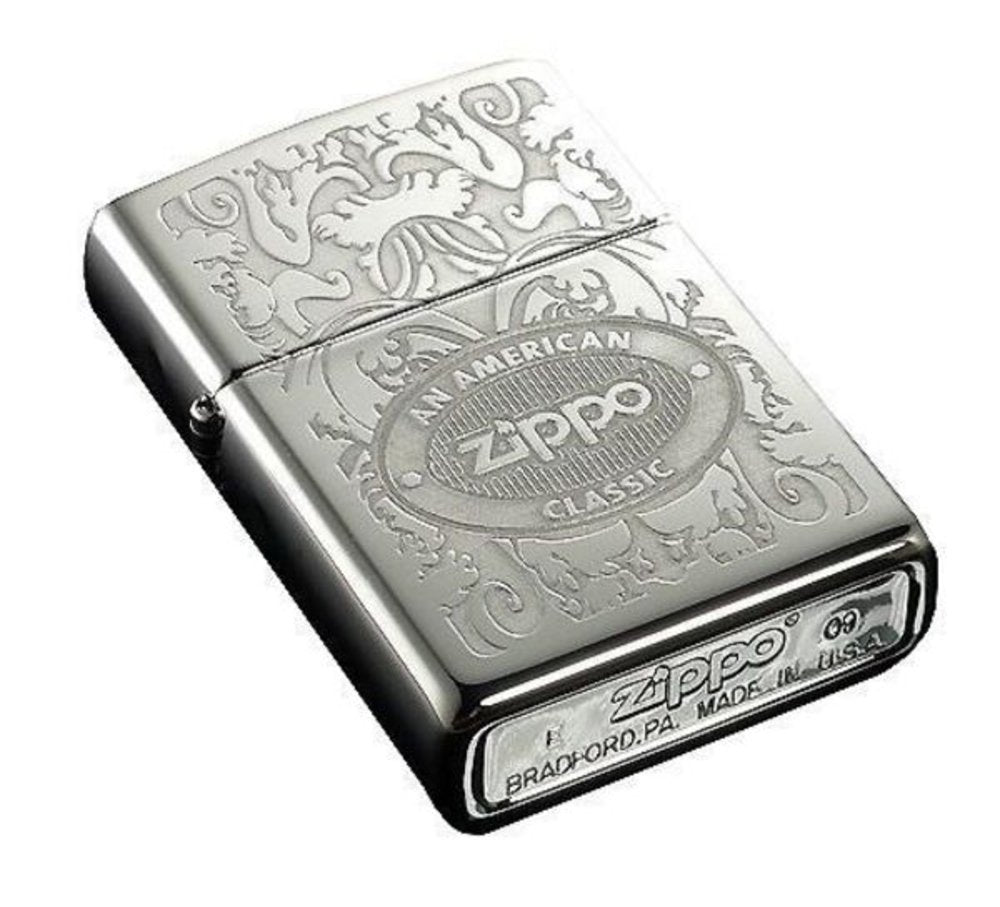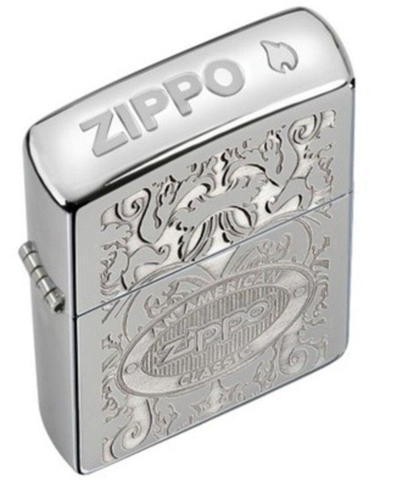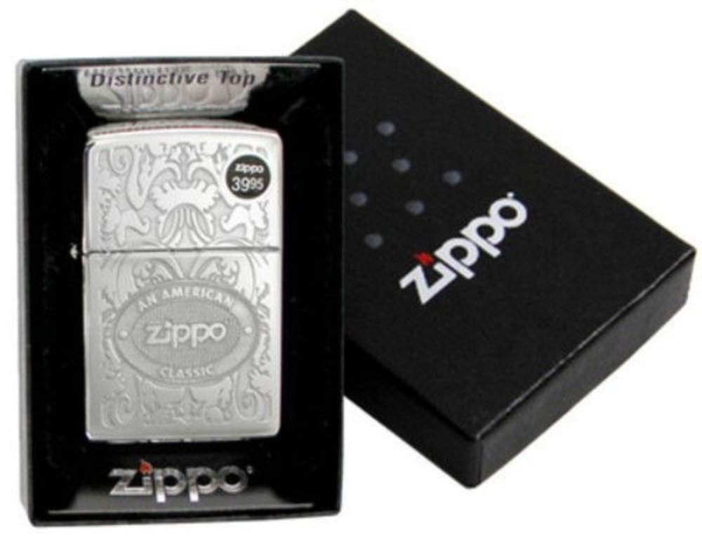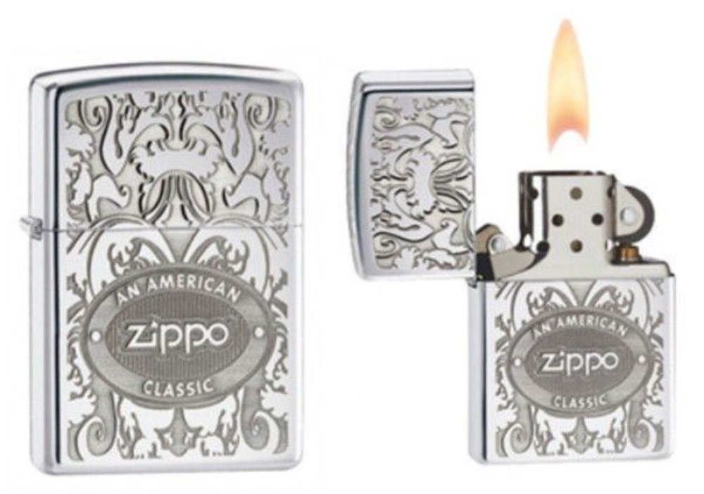 A true American Classic, this Zippo lighter features a detailed engraved pattern and Zippo logo. A creative and innovative Crown Stamp is featured on the very top of this high polish chrome lighter. Genuine Zippo windproof lighter comes with the famous Zippo lifetime guarantee. Comes in an environmentally friendly cardboard gift box.