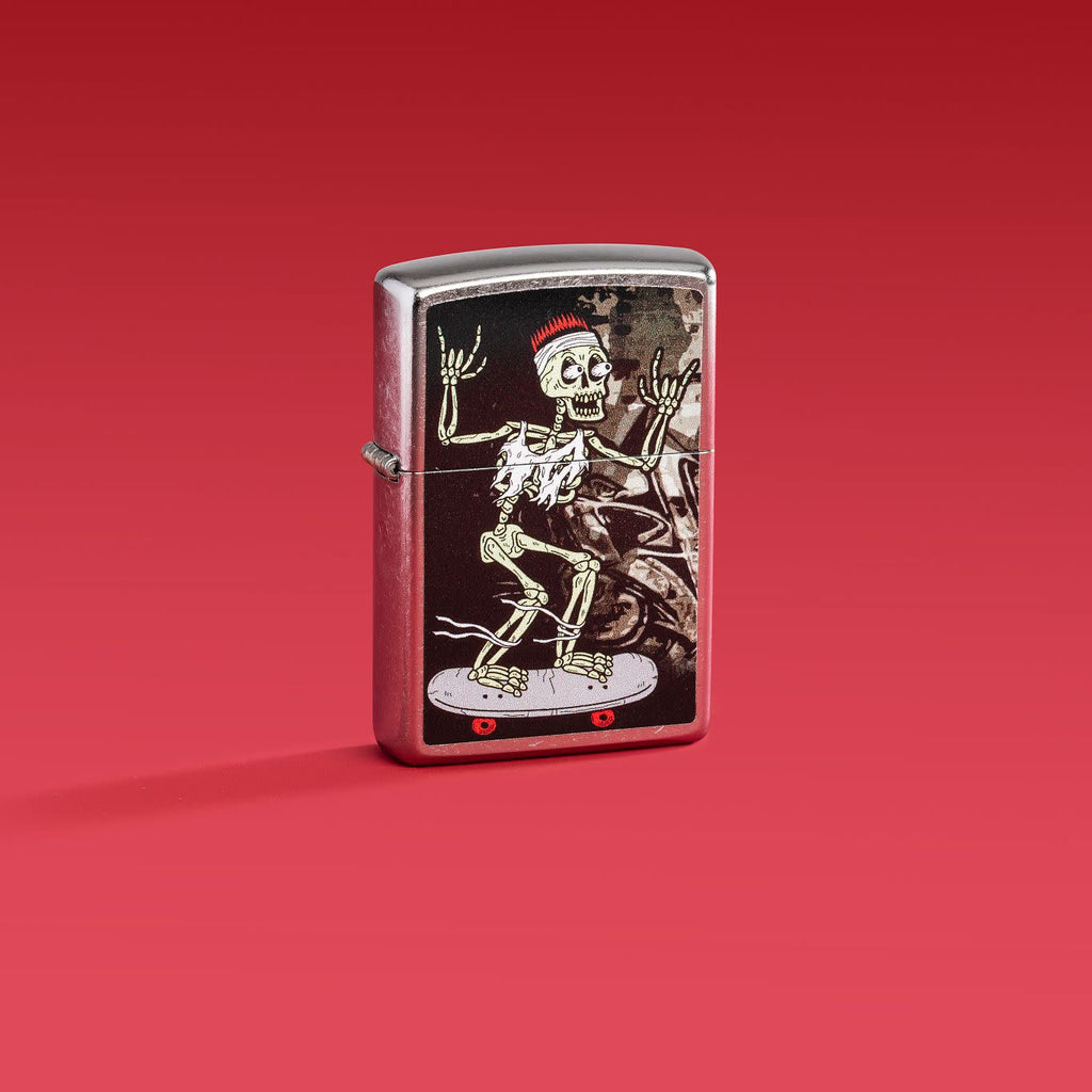 Skateboarding is life… and then some. A gnarly skeleton skates across the surface of this classic Street Chrome lighter in a playful Color Image design. Comes packaged in a gift box. For optimal performance fill with Zippo lighter fuel.